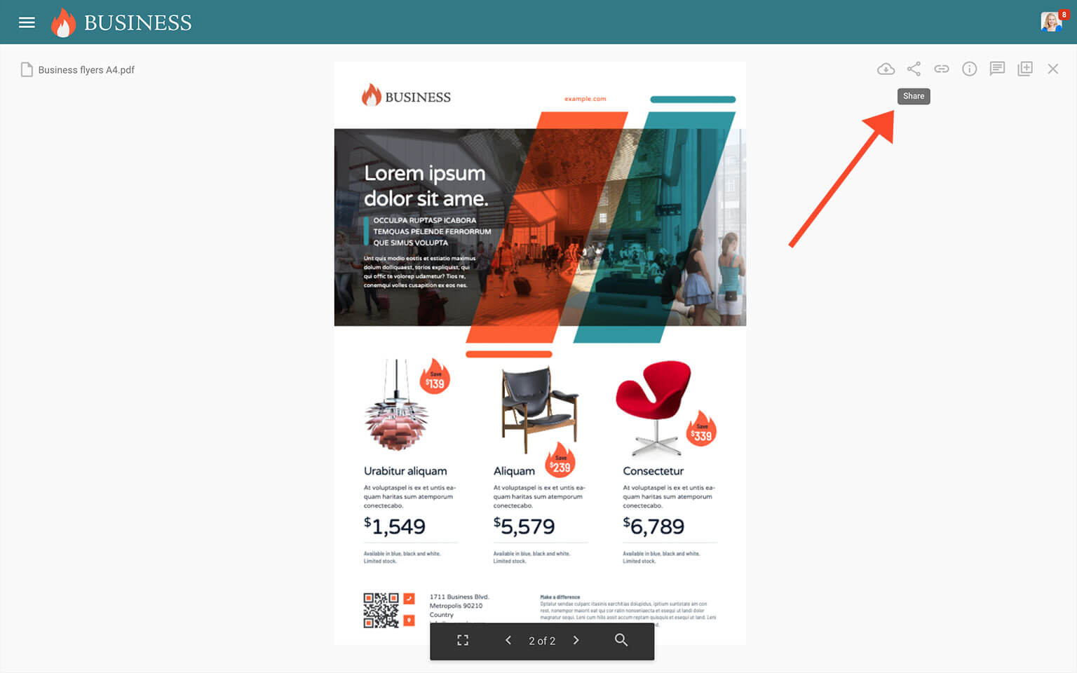 Navigate to the file you want to share, then click the  Share icon in the Toolbar.