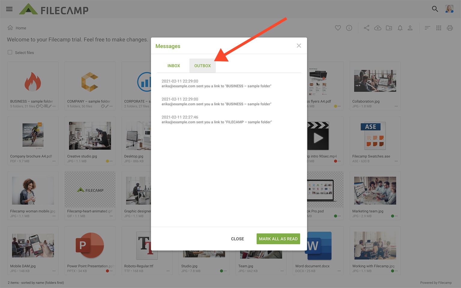 Upon navigating to the Outbox tab, you will see a list of all your messages sorted by date. The following notifications are displayed in your Outbox: